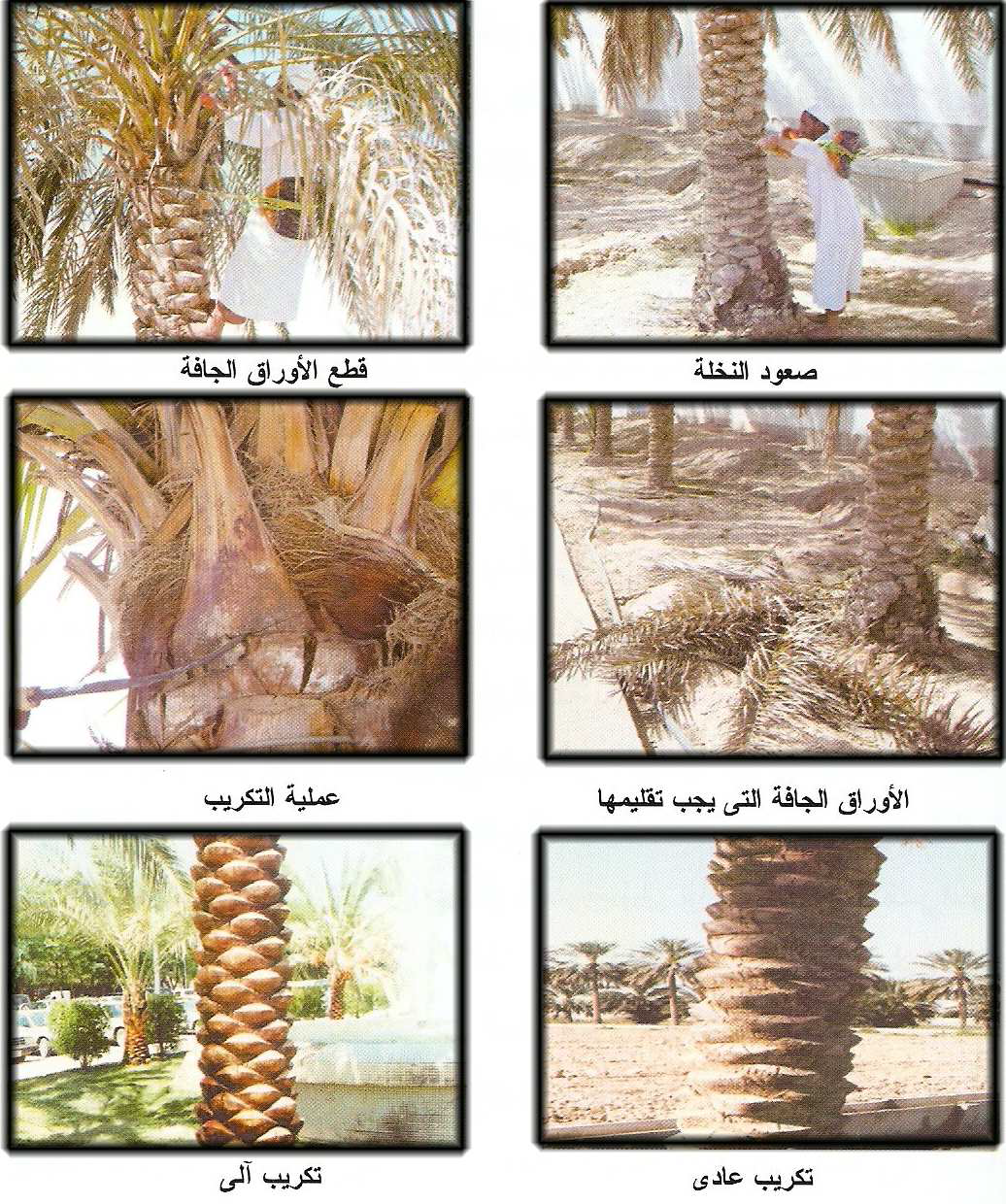 ٢. عملية التكريب وانتزاع الأشواك من السعف تسهل للعامل ارتقاء النخلة وإجراء عمليات خدمة رأس النخلة.